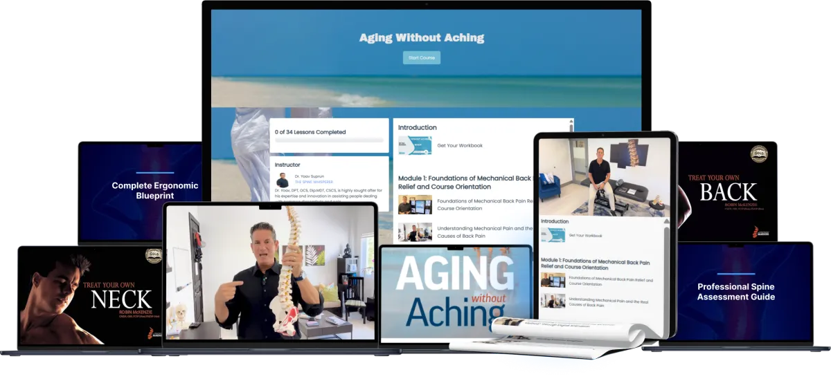 Digital Copy of Bestselling Book "Aging Without Aching™ - Dr. Yoav's complete guide to spine health, featuring detailed explanations, QR codes for video demonstrations, and case studies that complement your video training.